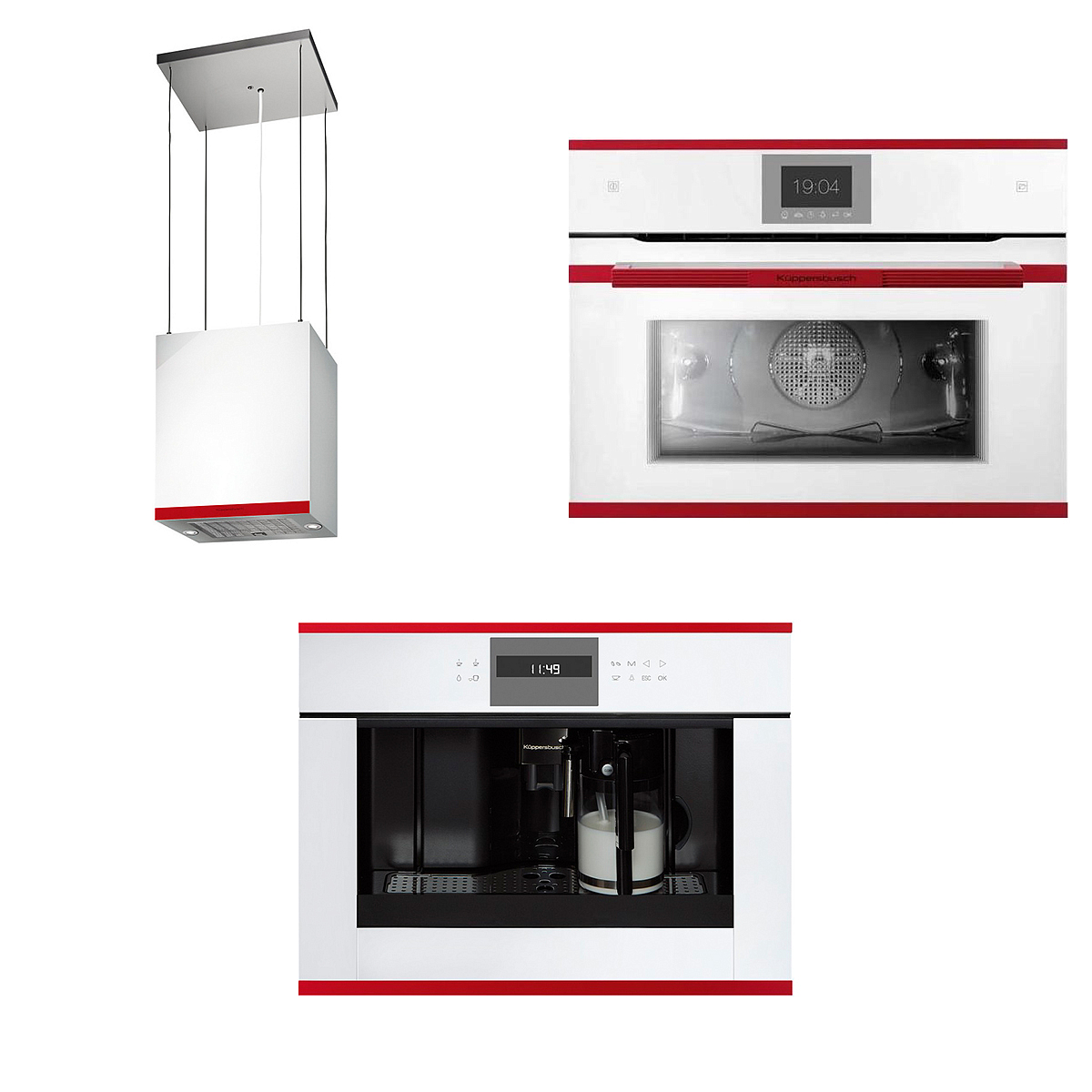 Kuppersbusch CBD 6550.0 W8 Hot Chili, CKV 6550.0 W8 Hot Chili, DI 3800.0 W8 выполнен в белом цвете с красными элементами декора. Компактный духовой шкаф с функцией готовки на пару можно разместить на малогабаритной кухне. Островная вытяжка работает в режиме рециркуляции может послужить как источник освещения благодаря светодиодным лампам. Встраиваемая кофемашина с автоматическим капучинатором оборудована регулировкой степени помола, температуры и регулировкой размера порции, чтобы получился идеальный напиток по индивидуальным предпочтениям пользователя.