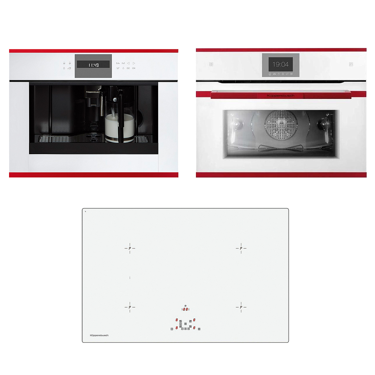 Комплект Kuppersbusch CBD 6550.0 W8 Hot Chili, CKV 6550.0 W8 Hot Chili, KI 8520.0 WR выполнен в белом цвете с красным декором. Компактный духовой шкаф оснащен сенсорным управлением и возможностью приготовления на пару. Индукционная варочная панель автоматически определяет наличие посуды, Режим Power поможет ускорить готовку. Встраиваемая кофемашина оборудована автоматическим капучинатором для создания идеальной молочной пены, функция очистки от накипи обеспечит комфортную эксплуатацию.