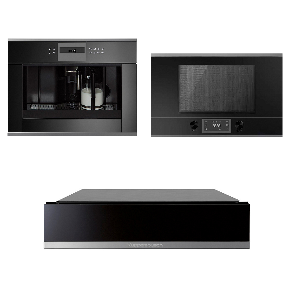 Комплект Kuppersbusch MR 6330.0 S3 Silver Chrome, CKV 6550.0 S3 Silver Chrome, CSW 6800.0 S3 Silver Chrome выполнен в черном цвете с хромированными элементами декора. Встраиваемая микроволновая печь оснащена 14 автоматическими программами для готовки и разогрева, конвекция и режим гриля позволят готовить сложные блюда как в духовом шкафу. Встраиваемая кофемашина оснащена автоматическим капучинатором для создания идеальной молочной пены, и возможностью готовить сразу на 2 чашки. Подогреватель посуды вмещает набор на 6 персон, а функция подъема дрожжевого теста позволит быстро подготовить его для последующей готовки.