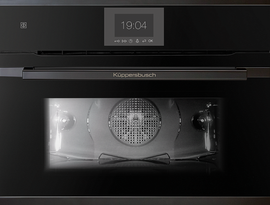 компактный духовой шкаф Kuppersbusch CBP 6550-0 S6 Black Steel — элегантное решение для тех, кто ценит точность и стиль в ограниченном пространстве. Его прямые линии, черное исполнение с отделкой BlackSteel и аккуратный сенсорный блок создают строгий, современный образ, который гармонично впишется в минималистичную кухню или встроенный гарнитур. Четырехслойная дверца с качественным остеклением придает прибору солидность и улучшает теплоизоляцию, а галогенное освещение обеспечивает равномерный обзор продуктов при контроле процесса приготовления.