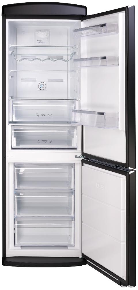 В холодильном отделении предусмотрено 3 полки из ударопрочного стекла, которые можно переставлять по высоте, 3 полки на двери и 2 ящика для овощей и фруктов. В морозильном отделении также предусмотрено 3 ящика, что позволяет эффективно использовать его объем. Функция суперзамораживания FastFreeze обеспечивает быстрое и эффективное замораживание продуктов. Холодильник оборудован одним компрессором, двумя камерами и двумя дверями. Дверной упор расположен справа. Класс энергопотребления E гарантирует экономичность его использования. Сигнализация открытой дверцы и сигнализация неисправностей предупреждают о возможных проблемах, что помогает продлить срок службы холодильника.