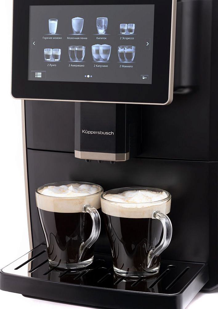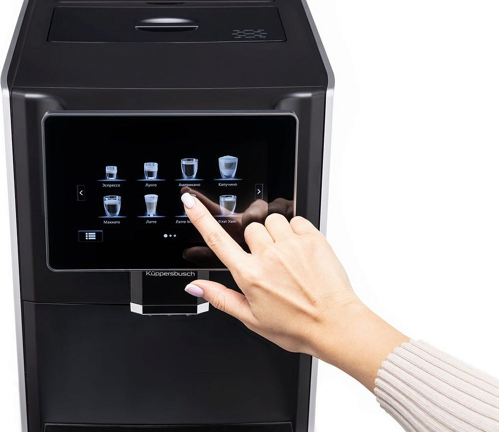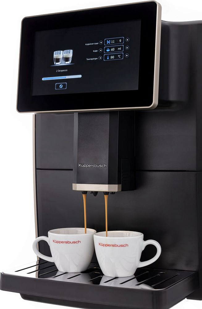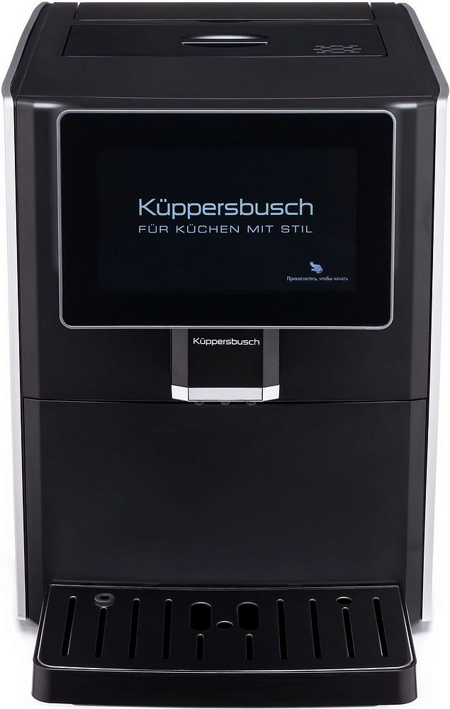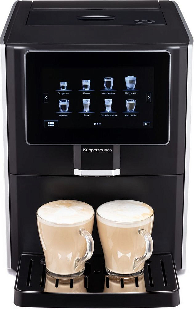 Автоматическая кофемашина Kuppersbusch KVS 308 B выполнена в черном цвете, прекрасно дополнит любой интерьер и не займет много места. Модель обладает габаритными размерами 35,6×28,3×46,3 см. Техника представлена отдельностоящего типа, её можно использовать как дома, так и в офисе, чтобы побаловать себя, родственников или коллег капучино, латте, кофе из зерен и многими другими напитками. Для управления и отображения информации в устройство встроен сенсорный дисплей, который загорается при включении и позволяет программировать работу девайса легкими и скользящими движениями.