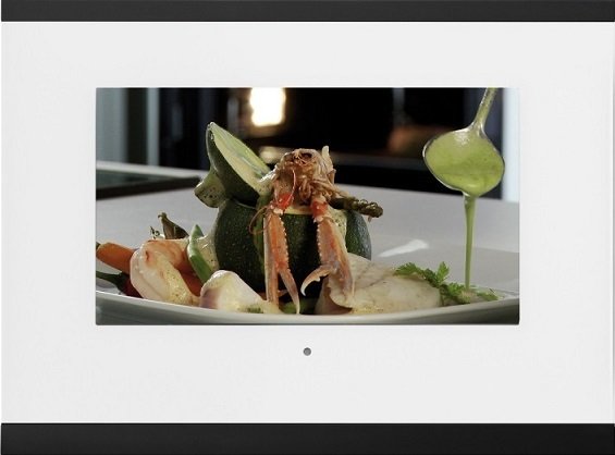 Кухонный телевизор Kuppersbusch ETV 6800.1 W5 предназначен для встраивания в нишу на кухне. Модель представлена в белом цвете и украшена благородной рамкой цвета «черный бархат».